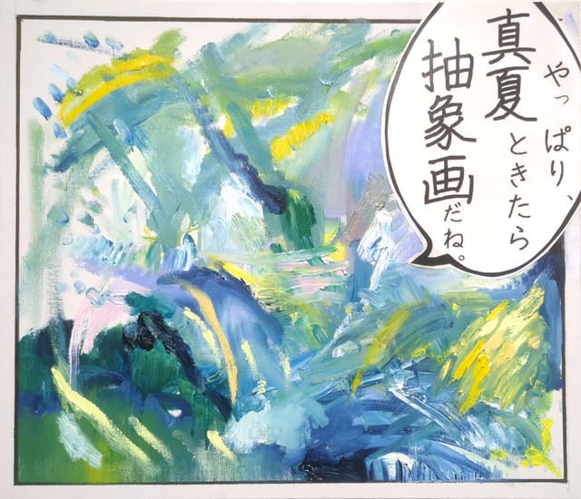 やっぱり、真夏ときたら抽象画だね。 2025 F10 キャンバス、油彩、コラージュ、マジックペン